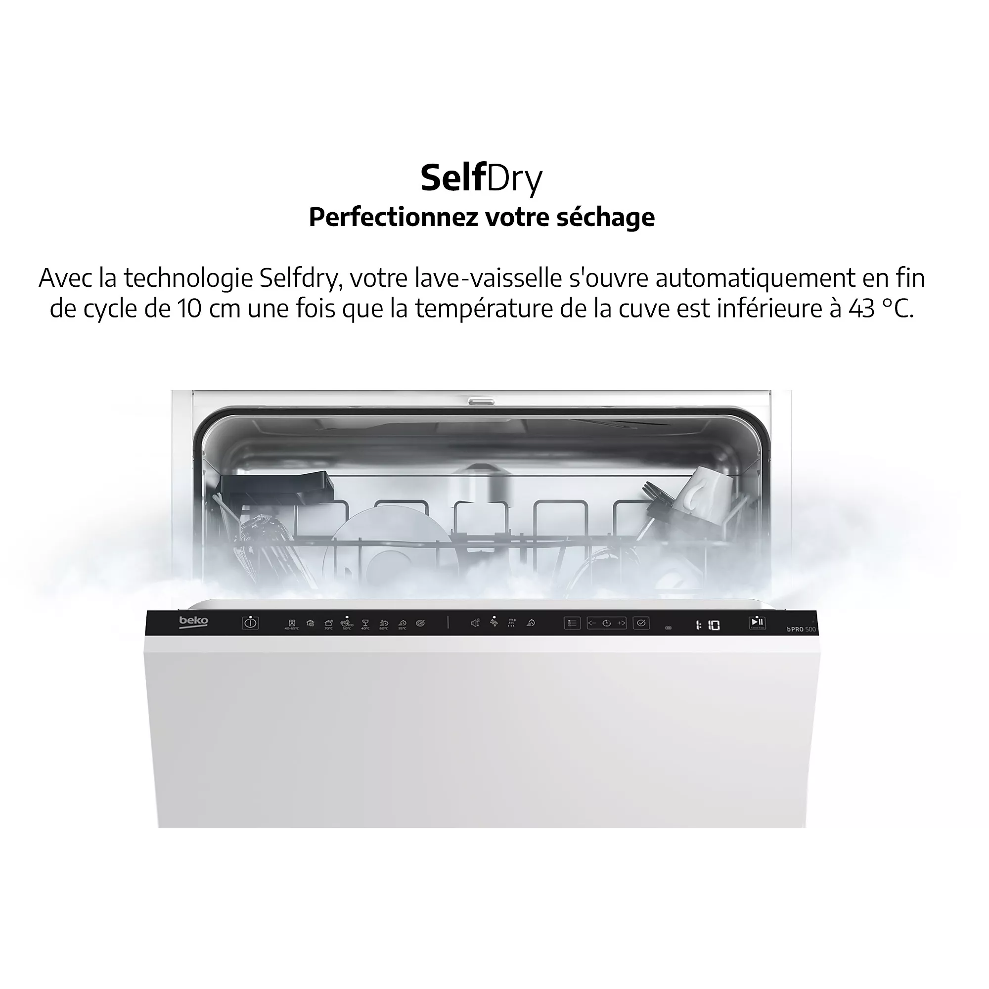 - Séchage naturel avec ouverture automatique en fin de cycle : plus besoin d’essuyer ou d’attendre.